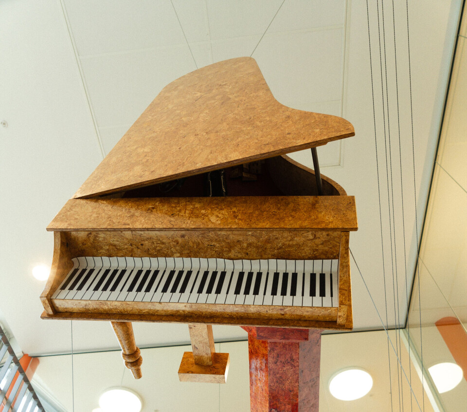 Sitter du og spiser i kantinen på Øya, kan det lønne seg å ta en titt i taket. Her henger et vakkert kunstverk som bruker former og materialer på fascinerende vis. Den største delen av verket er et gigantisk, brunt flygel som henger over trappen. Ut av flygelet stikker en hånd. Noen strenger er også festet til skulpturen. Disse strengene fører øyet videre innover i rommet. Dette er et kunstverk som er formet etter rommet det henger i. Kunsten og rommet blir ett. Det er vakkert og interessant å se på.