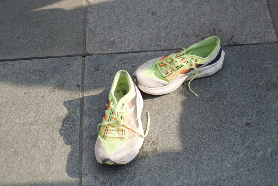 Han tar av seg de svette skoene og gliser stort.