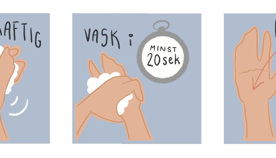 Når du så skal vaske hendene dine, er det viktig at du faktisk vasker hele hånden din. Dette gjør du best ved å bruke minst 20 sekunder på å skrubbe fingre, håndbak, håndledd og negler. For at såpen skal komme inn i alle kriker og kroker er det også lurt å bruke litt kraft.